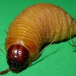 The eggs hatch into white larvae that eat soft fibres and terminal buds. They bore into the interior of the palm feeding on the soft succulent tissues. After one to three months the larvae pupate in cylindrical cocoons. This stadium of life cycle needs 14 to 21 days and ends with the hatching of the new generation of beetles.